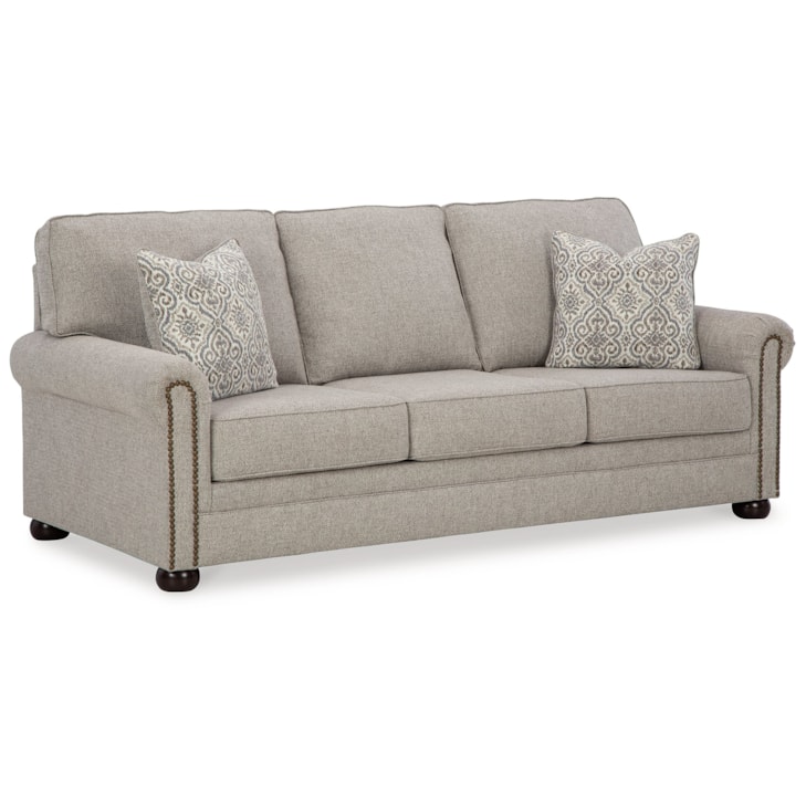 Inspired by the past but rooted firmly in the present, this queen sofa sleeper complements your transitional seating area. Its versatile upholstery is delightfully detailed for a subtle herringbone effect. Designer touches like decorative nailhead trim and bun legs add traditional character. A handy pull-out mattress brings must-have function. With this sofa sleeper’s reliable style and comfort, all you need to do is sit back and relax.