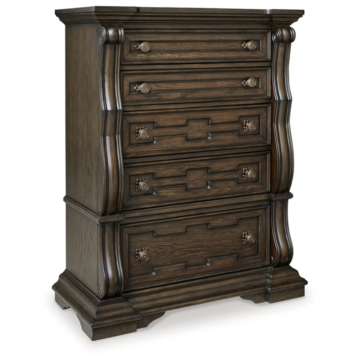 From its ornamental appliques to its large scale, this chest of drawers makes a bold statement. Spacious drawers store your clothes and more in stunning style. The look is timeless. The feel? Right at home.