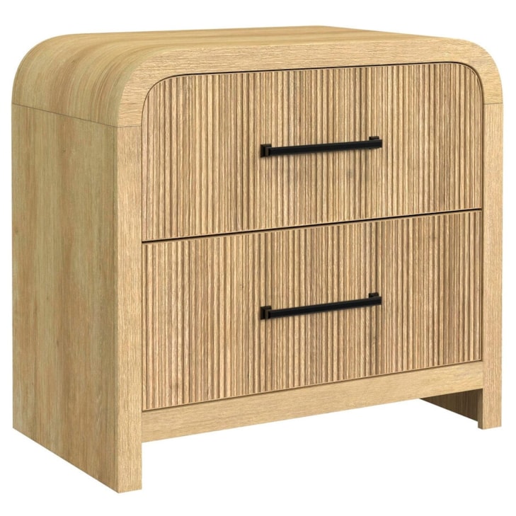 This contemporary nightstand is designed to bring a touch of modern style to your bedroom. With its light wood tone and natural grain finish, it adds a warm and inviting ambiance to the room. The two drawers provide ample storage space for your personal items, and the black bar pulls add a sleek and sophisticated touch.The nightstand also features USB ports, making it easy to keep your devices charged and within reach. The natural color and finish of the wood give the piece a timeless look that will complement a variety of decorating styles. Made from high-quality wood, this nightstand is both durable and stylish, ensuring it will remain a staple in your bedroom for years to come.With its contemporary design and functional features, this 2-drawer nightstand is the perfect addition to any bedroom. Whether you’re looking to update your current furniture or starting from scratch, this piece is sure to provide the perfect blend of style, storage, and convenience.