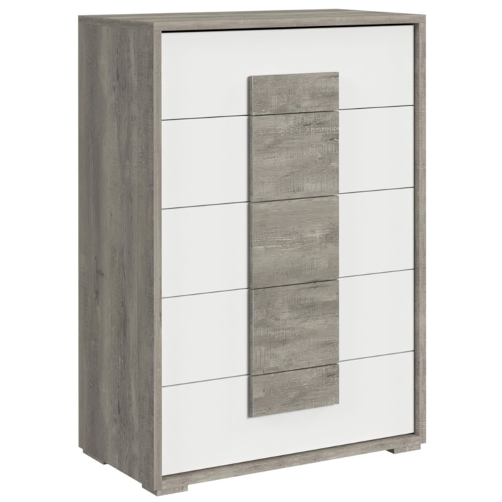 This contemporary 5-drawer chest is the perfect addition to any bedroom, offering ample storage and a sleek, modern design. The gray wood tone and white, ash grey color combination creates a calming and serene atmosphere, while the fabric-lined drawers provide a soft, luxurious touch.With five spacious drawers, you’ll have plenty of room to store your clothes, linens, and personal items, keeping your bedroom tidy and organized. The fully assembled design ensures that you can start enjoying your new chest right away, without the hassle of assembly.The wooden construction and contemporary design style make this chest a sturdy and stylish piece of furniture that will complement any bedroom decor. Please note that due to lighting, the product color may slightly vary from the images, but the overall aesthetic remains the same.Whether you’re looking to upgrade your existing furniture or create a brand-new bedroom sanctuary, this 5-drawer chest is an excellent choice. Its combination of functionality, style, and quality craftsmanship makes it a valuable addition to any home.