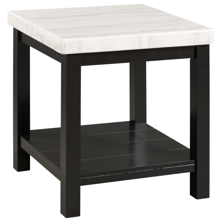 This end table will give your living room the update youve been craving! This accent table features a solid, marble table top, that contrasts beautifully with the black wooden base. This end table comes with a bottom shelf, ideal for displaying your favorite decor. The plank style shelf adds extra character to this already stunning piece. Add this gorgeous piece to your home today for a look that will last year after year.