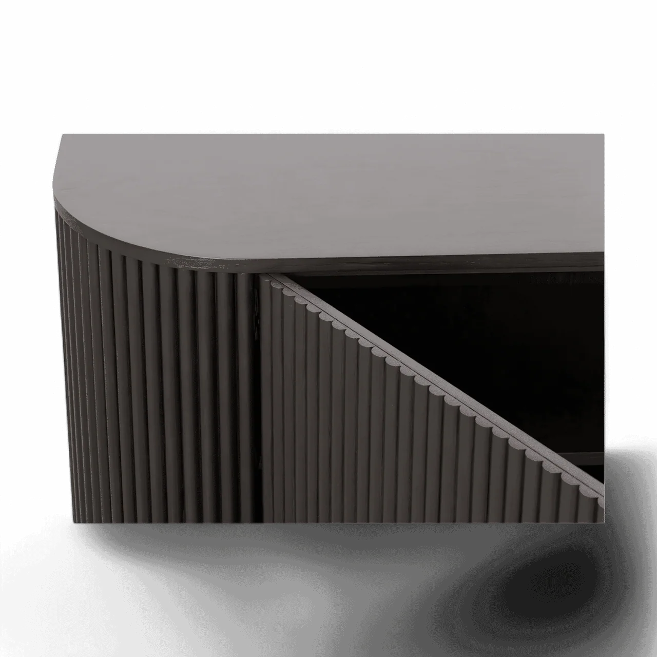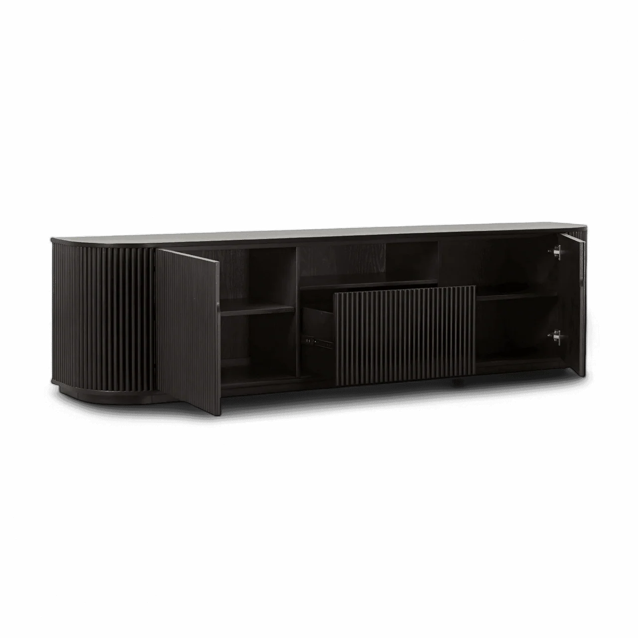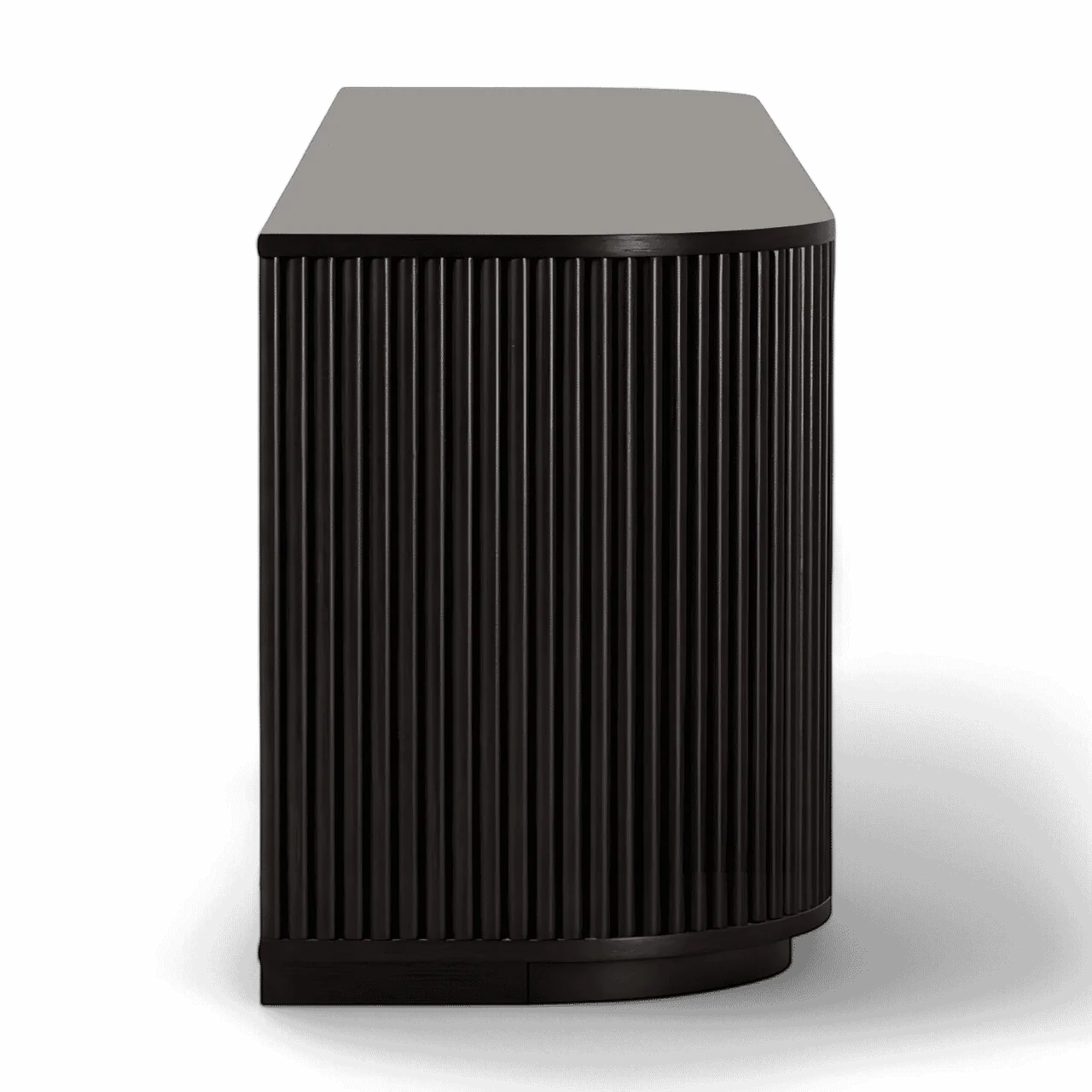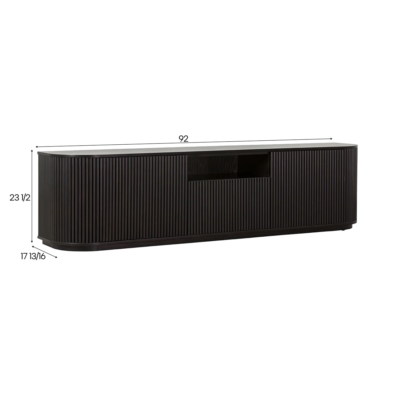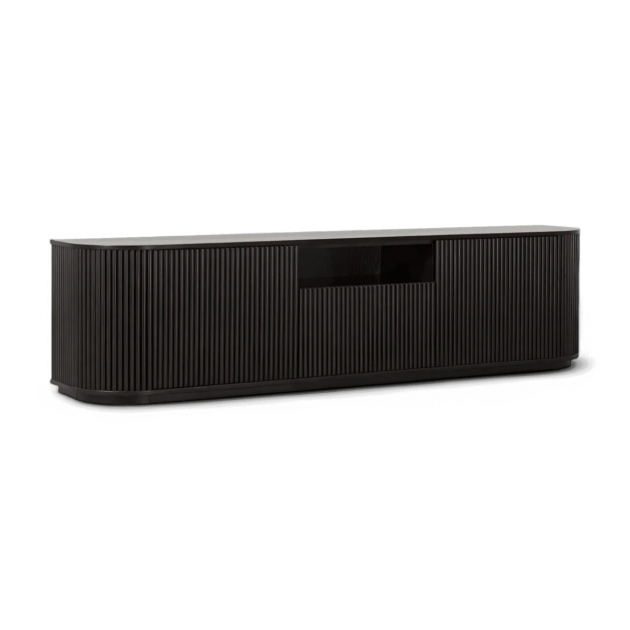The Oxford TV Stand Black Wood is a stylish and modern piece of furniture that beautifully combines functionality with contemporary design. Its rounded sides add a soft, inviting touch, while the front panels boast an eye-catching vertical wood slat design, making it a standout addition to any living space.