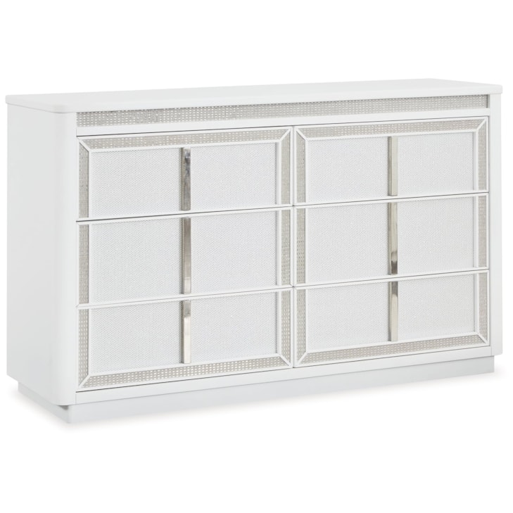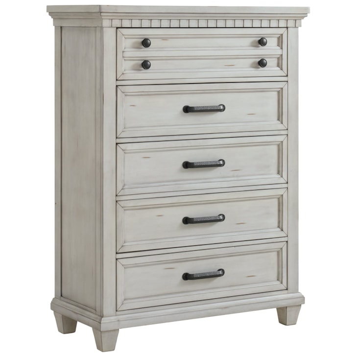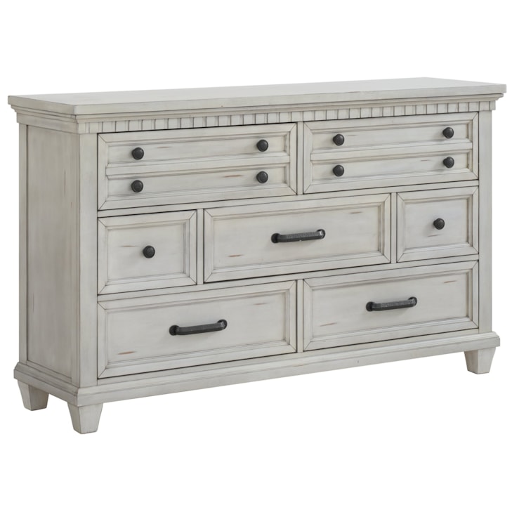 The 7-Drawer Dresser brings both style and functionality. It features multiple sized drawers that are ideal for finding a spot for all your different belongings. The two top drawers feature hidden drawers and all are felt-lined, perfect for storing away more delicate items. Dental molding outlines the top front edge and gives this classic piece an added flair. Dark metal hardware complements the antique white finish.
