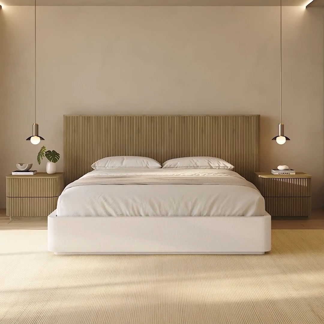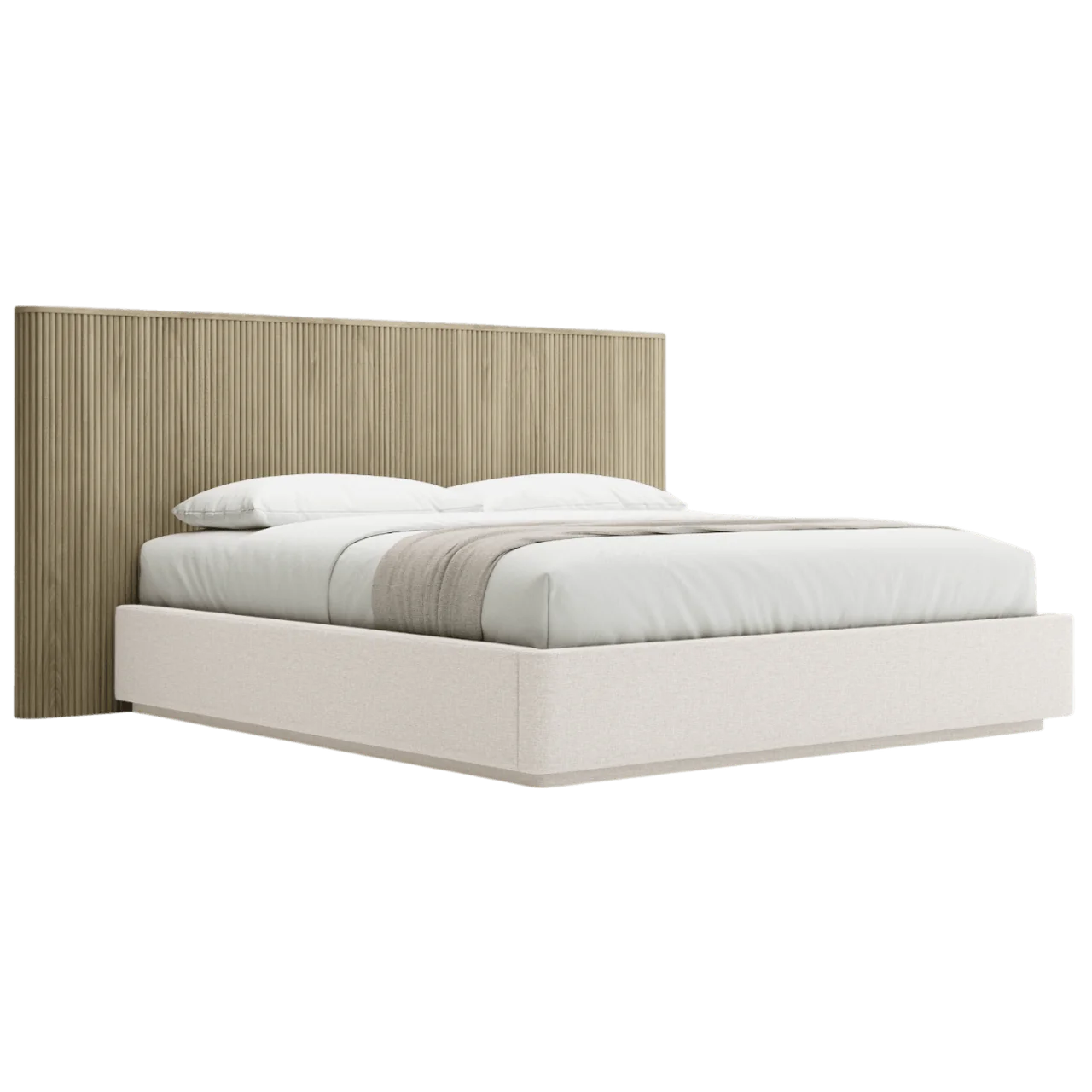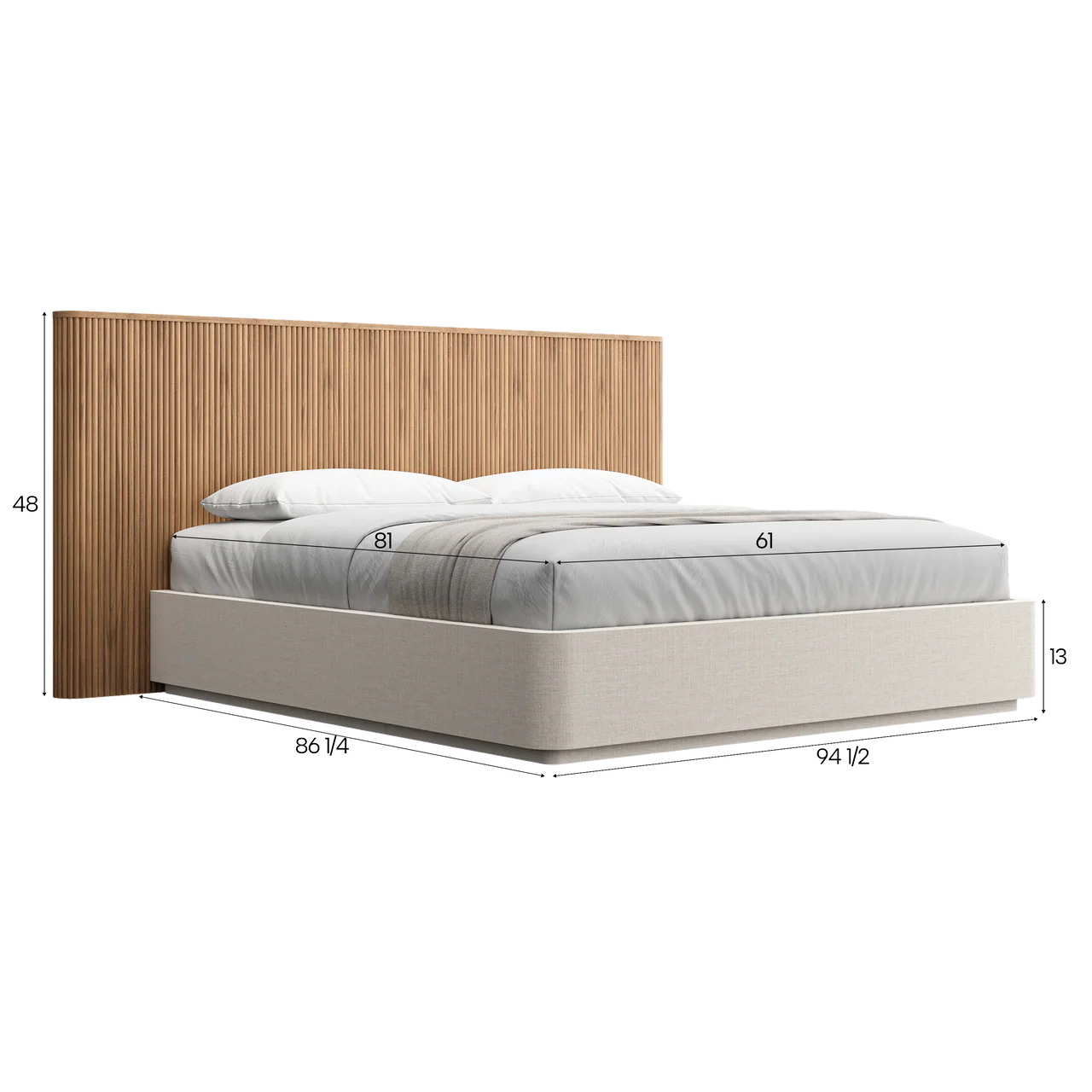 The Oxford Bed blends modern sophistication with natural charm, making it a standout centerpiece for any bedroom. The headboard showcases a sleek wood slat design, adding warmth and texture, while the cushioned fabric side rails in a versatile greige tone provide a touch of soft elegance. The harmonious combination of materials and its clean, minimalist lines offer a contemporary aesthetic that feels grounded and inviting, perfect for creating a serene retreat.