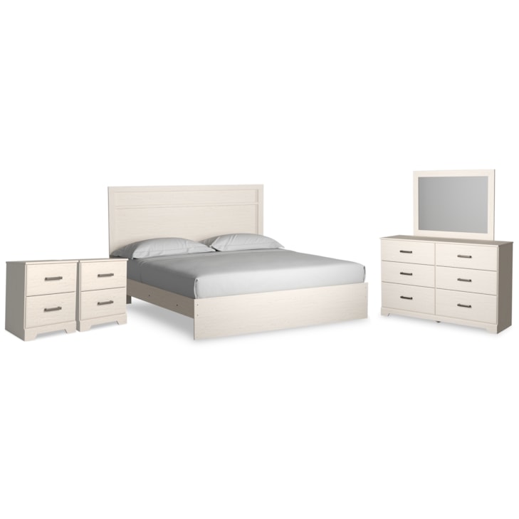 With its clean-lined look and modern attitude, this bedroom package is a fresh style awakening. A crisp, white hue over subtle replicated wood grain easily complements your existing aesthetic. Smooth drawer fronts with antiqued pewter-tone handles complete the look—proof that beauty lies in the details.