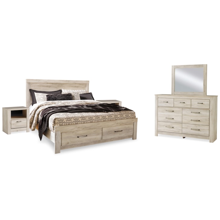 King Panel Storage Bed, Dresser, Mirror And 2 Nightstands