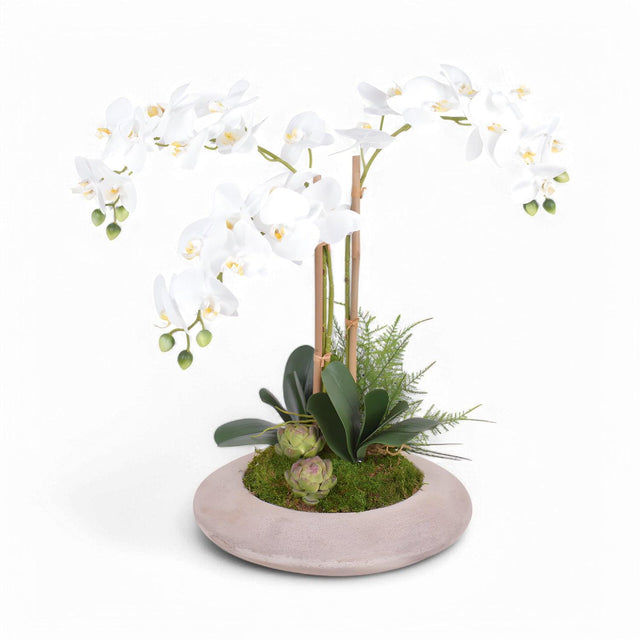 Elevate your interior with the sophisticated charm of the Noche Arrangement, a striking 27-inch-tall lifelike floral display. Showcasing graceful white orchid blooms that arch elegantly, this arrangement is beautifully complemented by vibrant greenery, cascading succulents, and a bold red-toned succulent accent. Set in a chic gold-tone pedestal base, the design exudes modern luxury while adding a natural, refreshing touch to any space. Perfect as a centerpiece or statement décor piece, the Noche Arrangement brings timeless elegance and effortless beauty to your home or office.