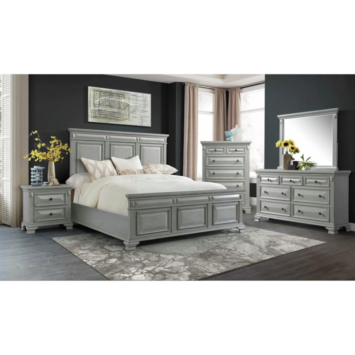 This King Panel 3-Piece Bedroom Set is the bedroom set your home desperately needs! This trio comes with a bed, chest and nightstand. The panel bed features a high profile headboard, adding a little extra drama to your bedroom. The case pieces offer plenty of storage space to properly store away your belongings. The top drawers in the case pieces are felt-lined in black, helping protect your more delicate belongings. The bottom drawers are cedar lined and also come with a dust proofing layer; adding an extra layer of protection for your belongings. Bevel edges are featured throughout and pair beautifully with the grey finish; making this transitional bedroom set a staple for years.
