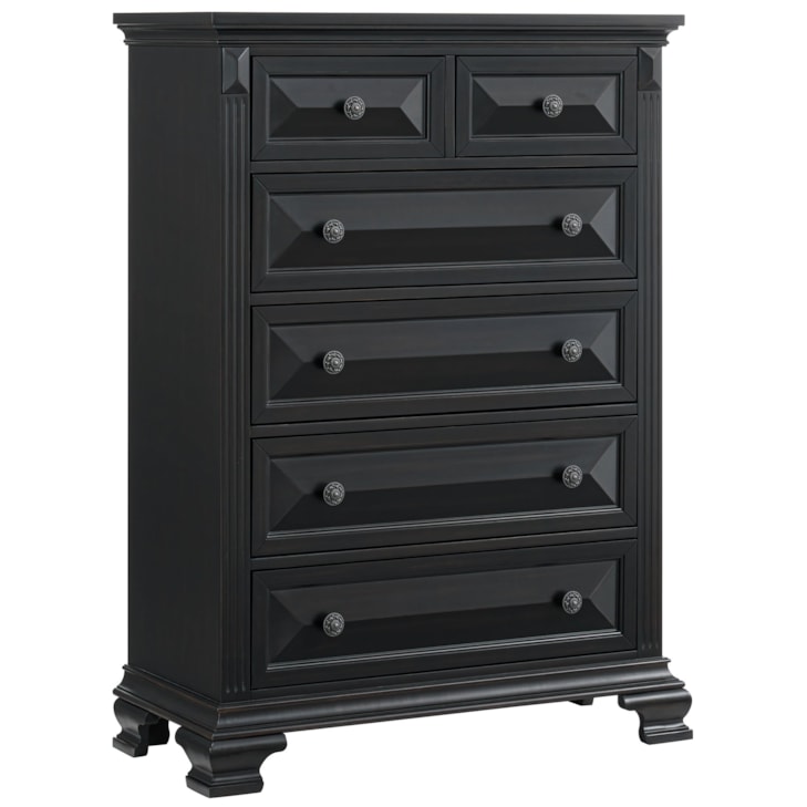The 6-Drawer Chest in Black is the perfect addition to any bedroom. This case piece is designed with beautiful beveled design throughout, adding a touch of elegance to your decor. The black finish features faint distressing for a unique look, while the metal knob hardware adds a contrasting touch. The top drawers are lined with grey felt to protect delicate items, while the bottom drawer features cedar veneer for added durability. With ball bearing drawer guides and an anti-tipping kit included, this chest is as functional as it is stylish. Bring sophistication and organization to your bedroom with this piece from the collection.