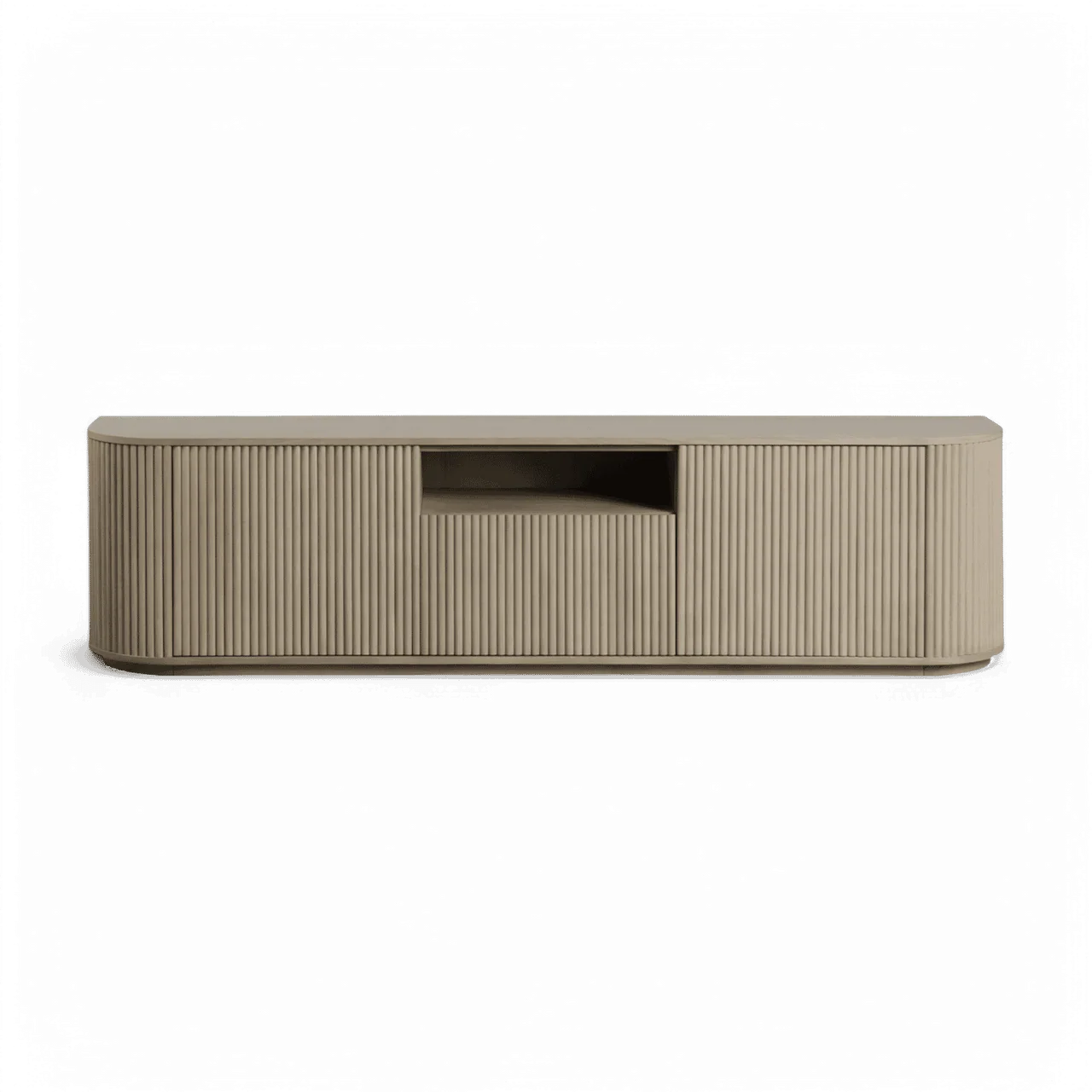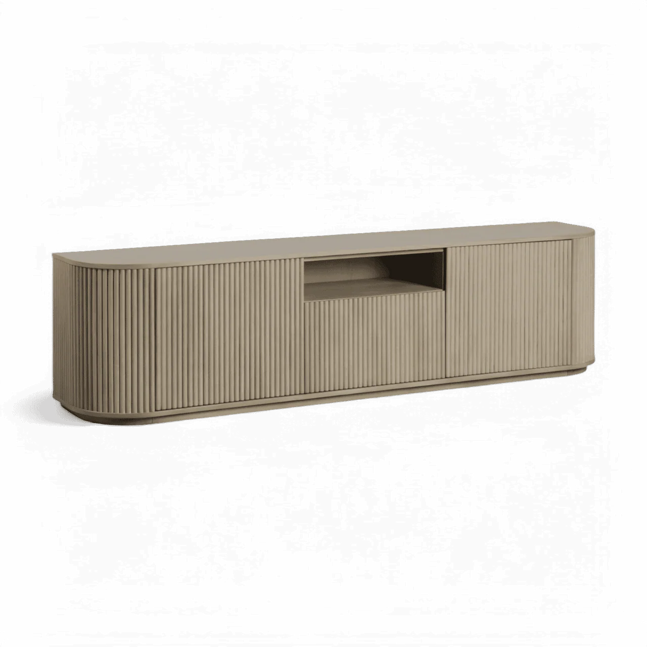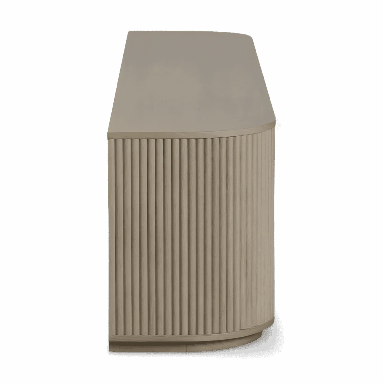 TV stands Contemporary the Oxford TV Stand Greige Oak is a stylish and modern piece of furniture that beautifully combines functionality with contemporary design. Its rounded sides add a soft, inviting touch, while the front panels boast an eye-catching vertical wood slat design, making it a standout addition to any living space.
