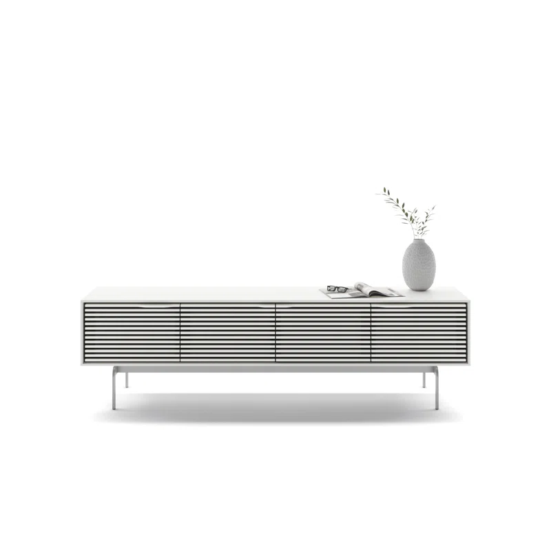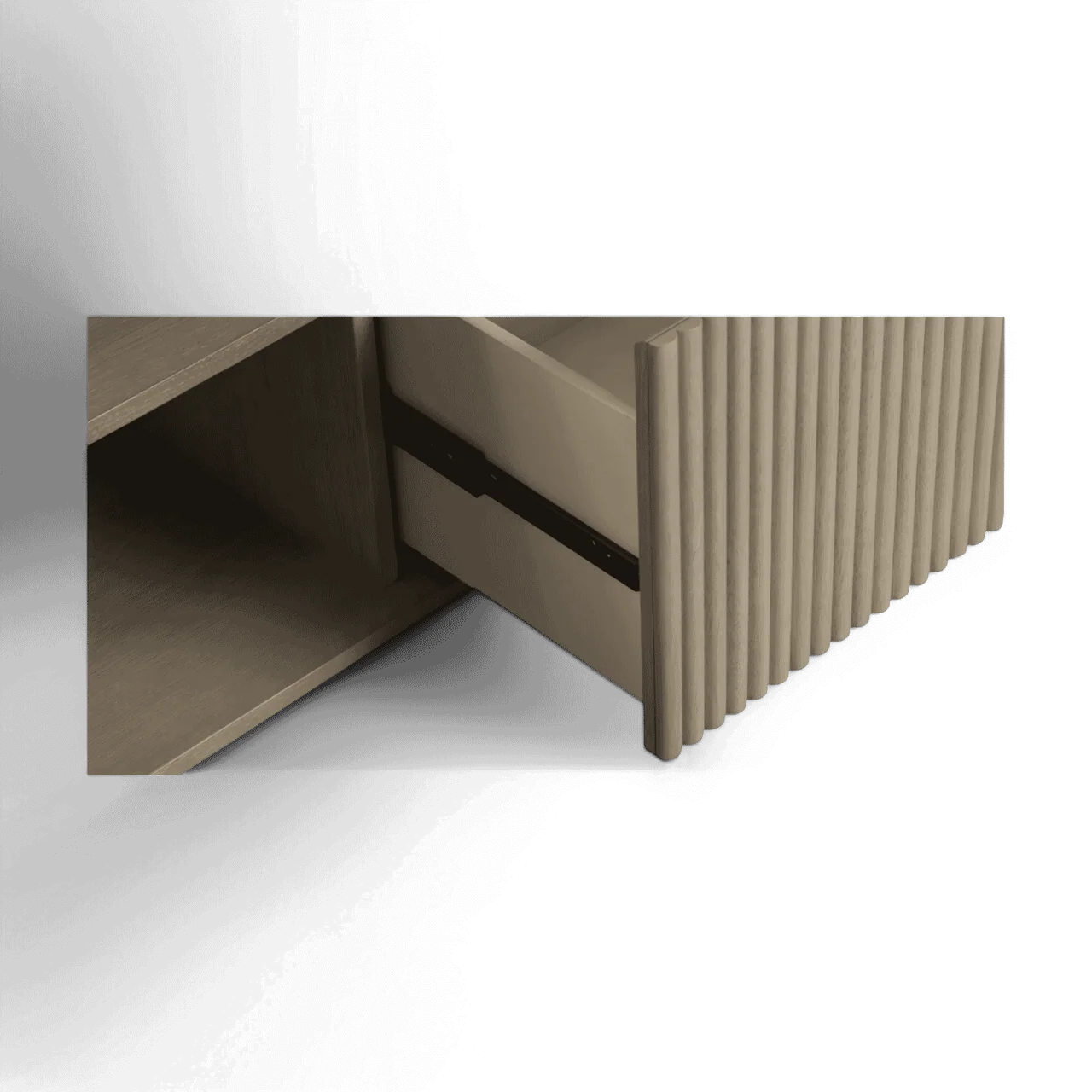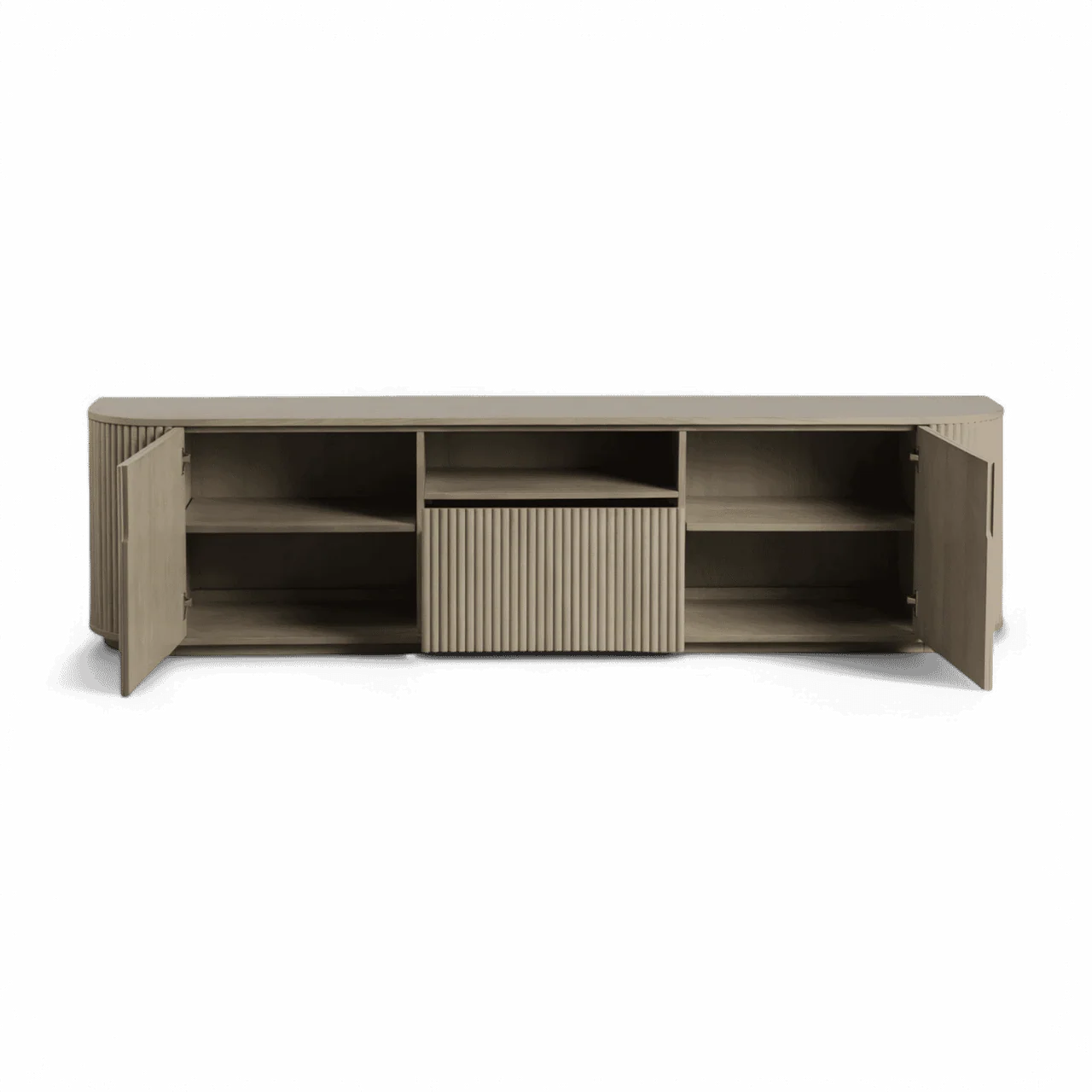 TV stands Contemporary the Oxford TV Stand Greige Oak is a stylish and modern piece of furniture that beautifully combines functionality with contemporary design. Its rounded sides add a soft, inviting touch, while the front panels boast an eye-catching vertical wood slat design, making it a standout addition to any living space.