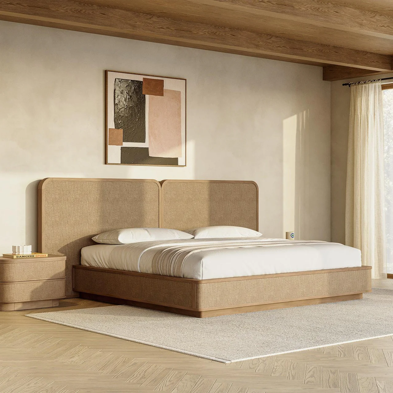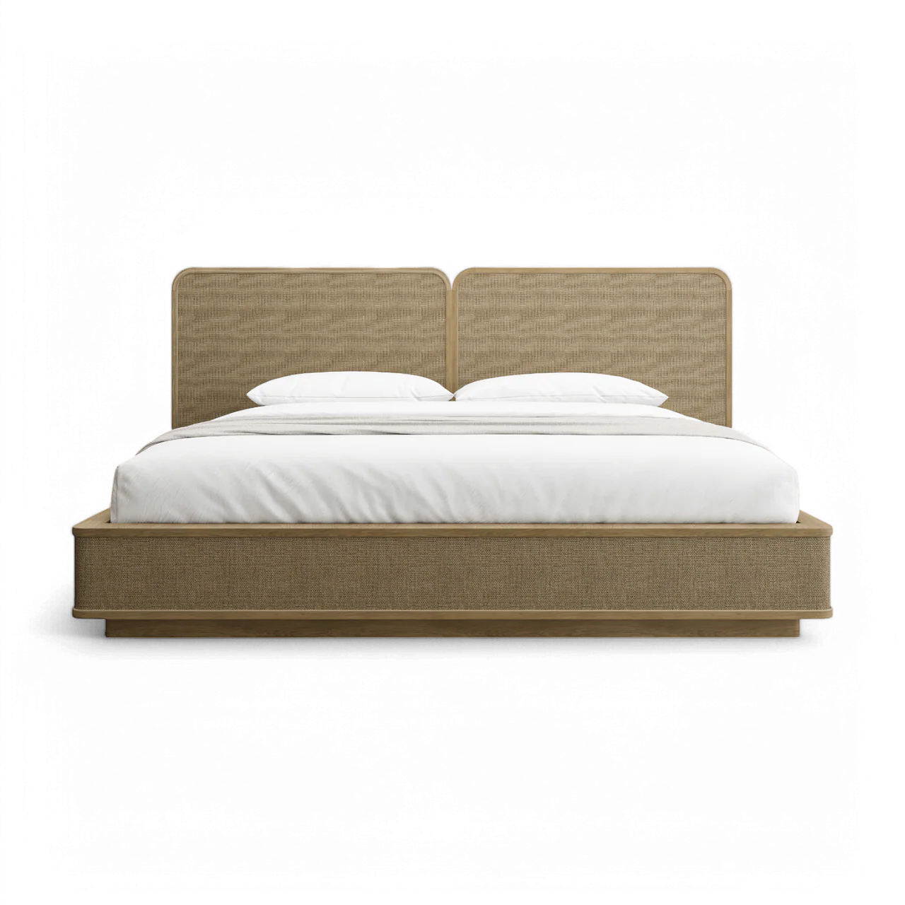 Top Finish: Greige Oak Veneer, Cane | Inner Frame Material: Rubberwood | Base Material: Rubberwood | Wood Slat Bed Foundation Many of our pieces are hand-crafted from natural materials.