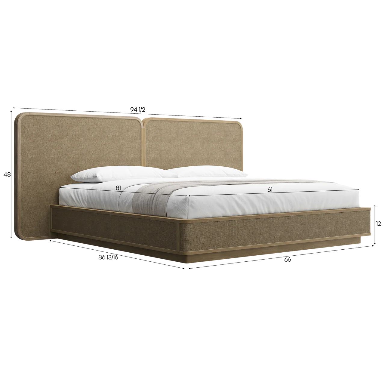 Queen: W: 94 1/2″ x D: 86 13/16″ x H: 48″